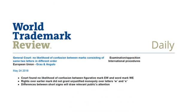 European Union – Grau & Angulo May 24 2018 In El Corte Inglés SA v EU Intellectual Property Office (EUIPO) (Case T-241/16, May 4 2018), the General Court has annulled the decision of the Second Board of Appeal of the EUIPO, thereby allowing the registration of the EU figurative mark EW. Read More