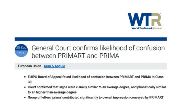 General Court confirms likelihood of confusion between PRIMART and PRIMA European Union – Grau & Angulo EUIPO Board of Appeal found likelihood of confusion between PRIMART and PRIMA in Class 30 Court con rmed that signs were visually similar to an average degree, and phonetically similar to an higher-than-average degree Group of letters ‘prima’ contributed…